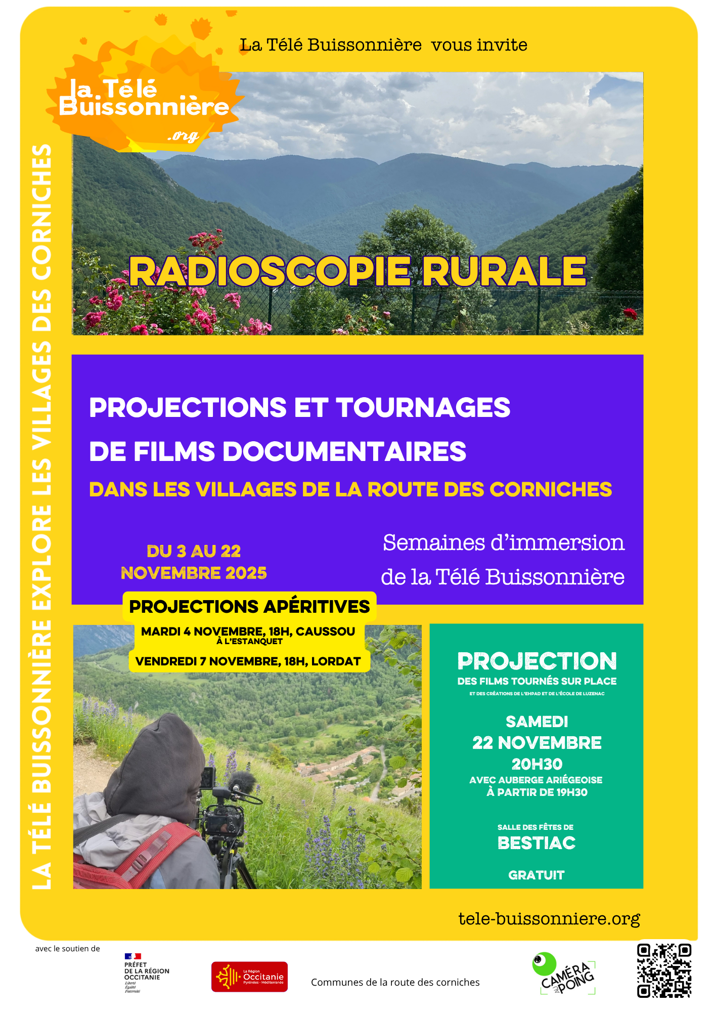 Du 03 au 22 novembre, trois réalisatrices de la Télé Buissonnière viendront réaliser des films sur la route des corniches. Elles passeront dans les villages de Caussou, Bestiac, Lordat, Axiat, Appy, Caychax et Senconac pour rencontrer les habitants et les habitantes.