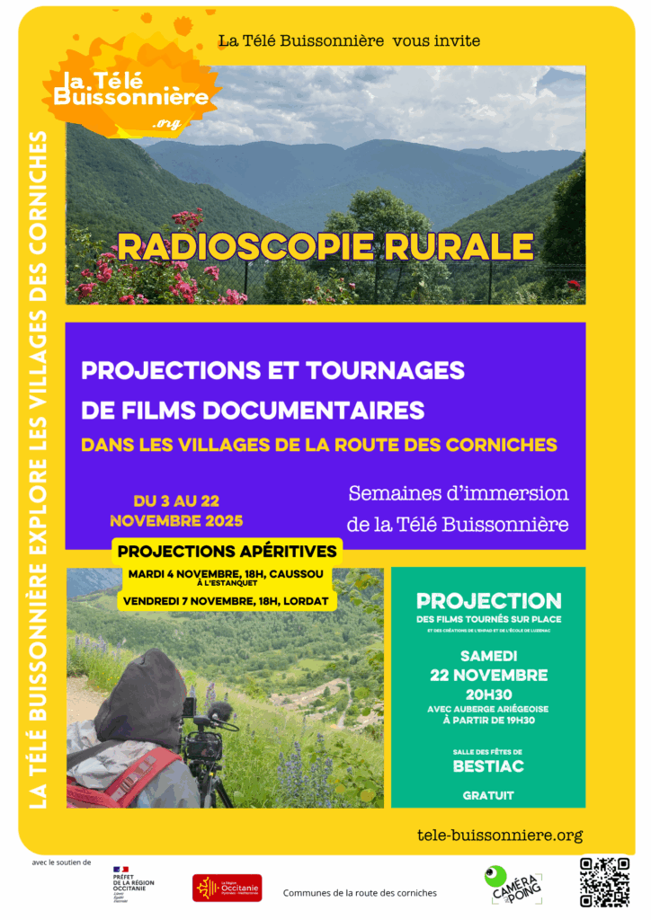Pour l’occasion, une projection de films de la Télé Buissonnière est prévue le vendredi 7 novembre à 18h, à Lordat, précédé d’un apéritif. Un moment convivial pour se rencontrer et parler de ce qui vous anime !